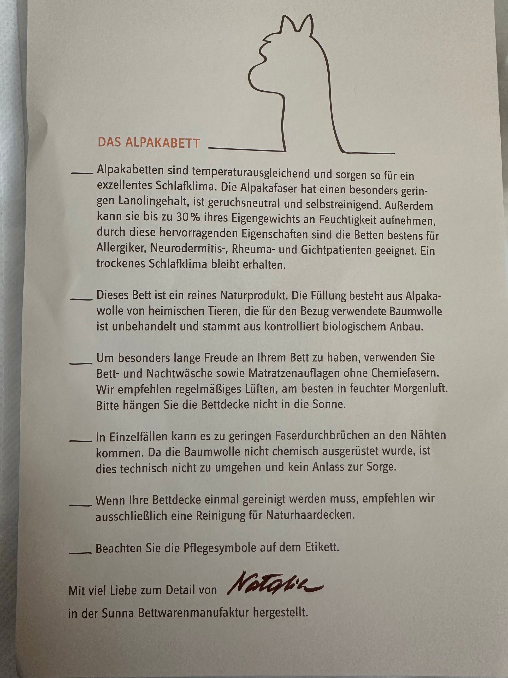 Das Bett ist ein reines Naturprodukt. Die Füllung besteht aus Alpakawolle meiner eigenen Tiere, die für den Bezug verwendete Baumwolle ist unbehandelt und stammt aus kontrolliert biologischem Anbau.