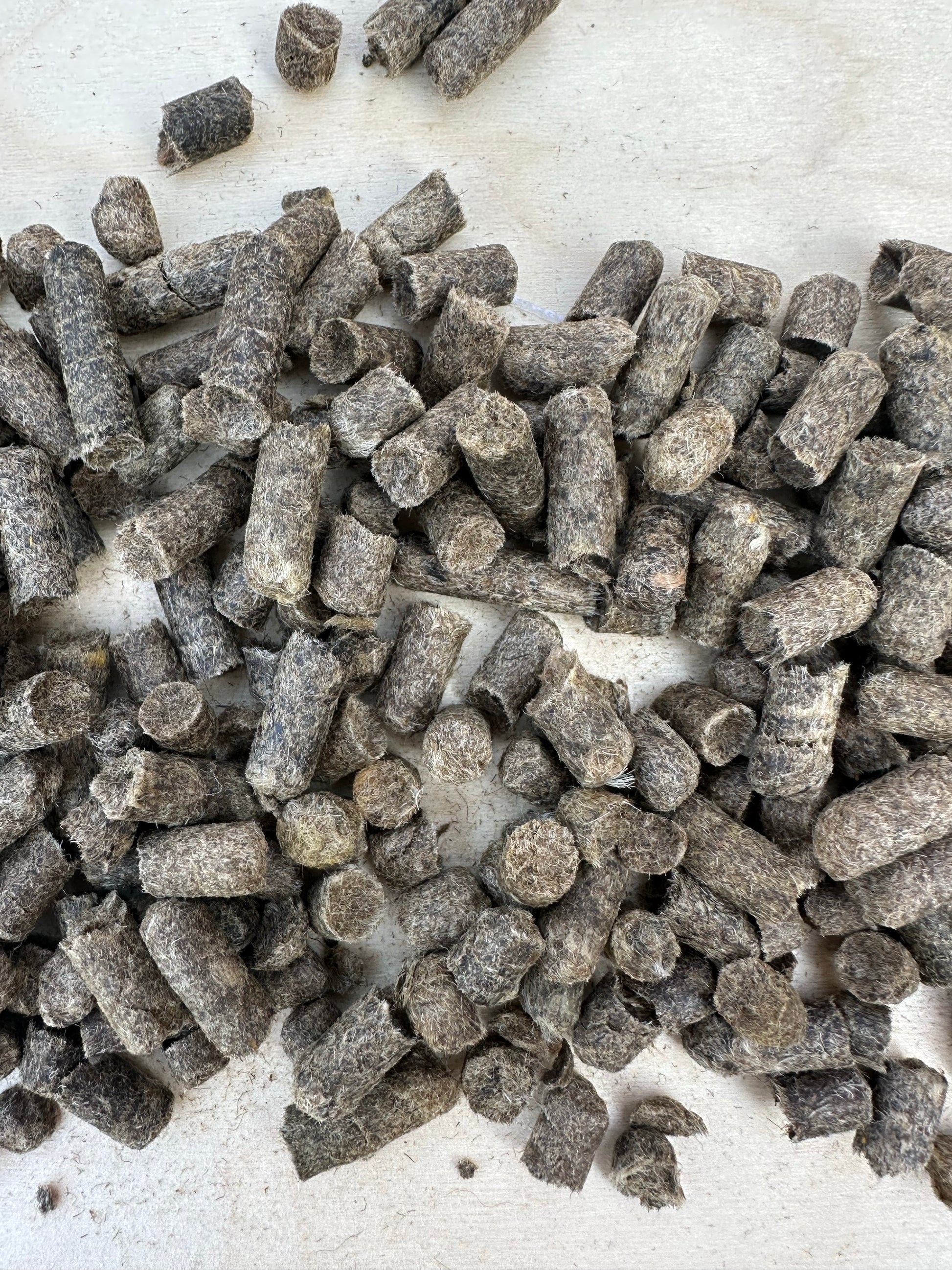 Alpakawollpellets werden aus einem Gemisch der Wolle heimischer, lebender Alpakas und Schafe hergestellt. Das Lanolin der Schafwolle dient als „Kleber“.